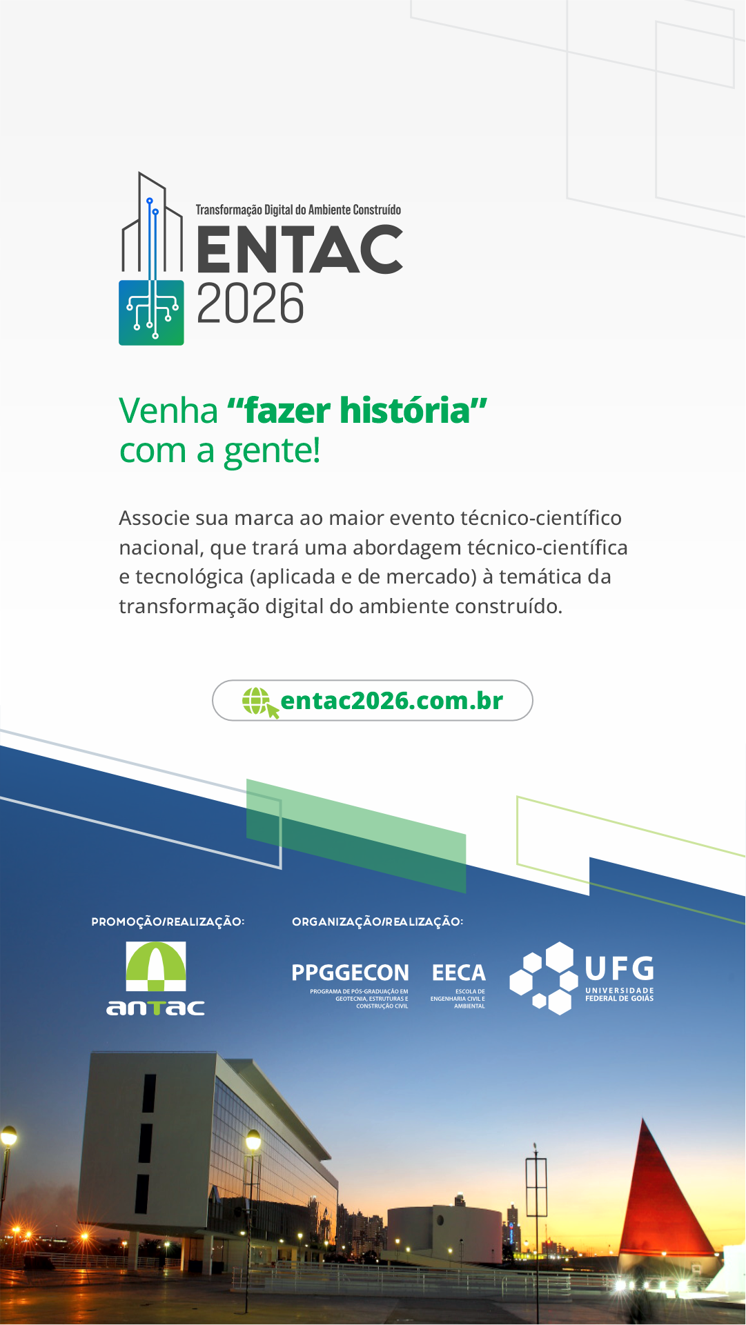 O XXI ENTAC (Encontro Nacional de Tecnologia do Ambiente Construído), organizado pela ANTAC, será realizado de 14 a 16 de outubro de 2026, em Goiânia (GO).